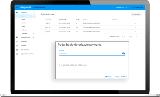 Treść zgłoszenia wraz z załącznikami jest szyfrowana na urządzeniu zgłaszającego (nie na serwerze!) i w takiej formie wysyłana do odbiorcy zgłoszeń.